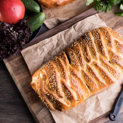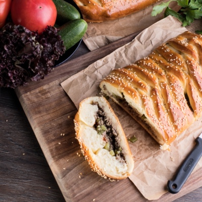 В нашем рецепте расскажем, как заплести такую красивую косичку — это совсем несложно. А еще добавим в начинку маринованные огурчики — получится необычно и пикантно.