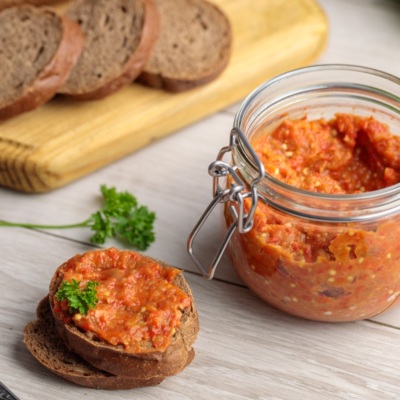 Это густой соус сербской кухни — айвар, который готовят из красного перца и баклажанов. Приправленный чесноком, уксусом, маслом и солью, он отлично подходит к мясу на гриле, курице и рыбе.