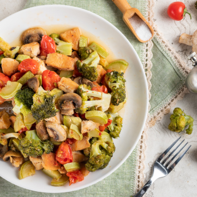 Добавить кабачки, брокколи, помидоры и соль. Обжарить 1 минуту и тушить 7-10 минут.