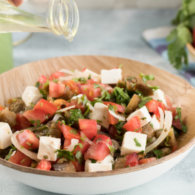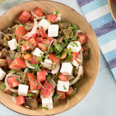 Сочетание баклажанов и помидоров — это всегда беспроигрышный вариант. А если к ним добавить еще фету или брынзу, то салат получится очень вкусным.