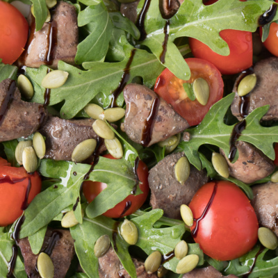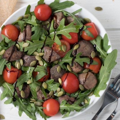 Выложить на тарелку поочередно рукколу, печень, нарезанные пополам помидоры черри.