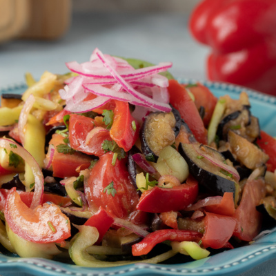 Этот овощной салат идеален в теплом виде и неповторим в холодном. Сочные помидоры, нежные и ароматные жареные баклажаны, хрустящий сладкий перец всегда выигрышно сочетаются друг с другом.