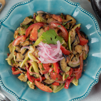 Теплый салат с помидорами и баклажанами