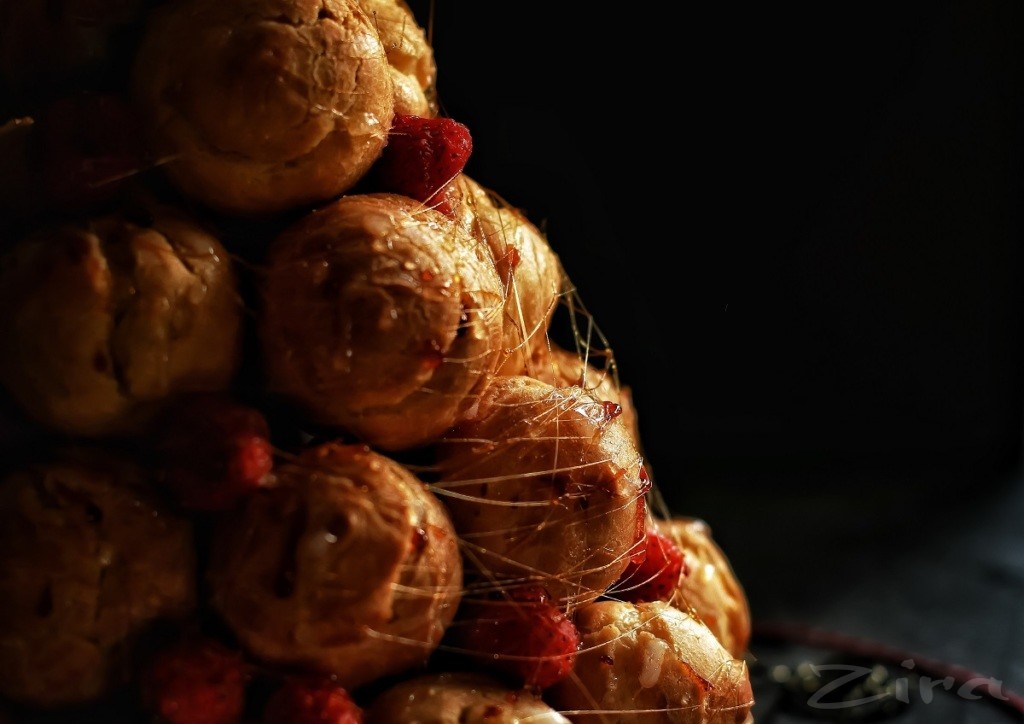 Когда «Крокембуш» будет собран, конус можно аккуратно вытащить — правда, если вы печете такой торт впервые, это может вызвать сложности. Ничего страшного, если конус останется внутри. Подавайте торт на стол, а при подаче аккуратно отделяйте профитроли друг от друга.