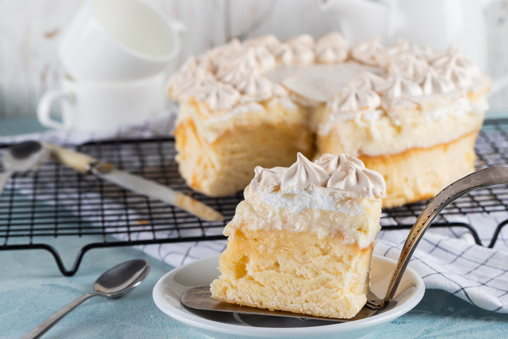 Мягкий корж, нежная творожная прослойка и «шапка» из воздушной сахарной меренги, соединяясь в одном пироге, создают привлекательные, контрастные по цвету и вкусу полосы.