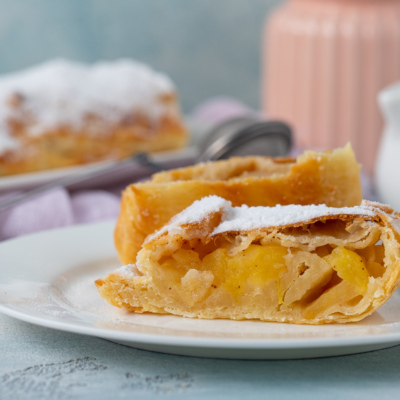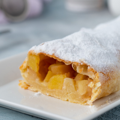 Выложить яблоки на тесто, посыпать их сахаром и корицей. Завернуть вертуту.