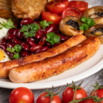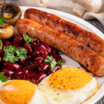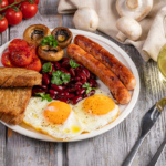 Традиционный английский завтрак состоит из обжаренных яиц, колбасок, фасоли и тостов, дополнением служат помидоры и грибы. Такой питательные завтрак поможет быстро насытится и запастись энергией на целый день.