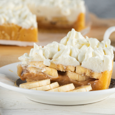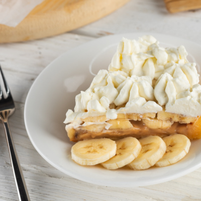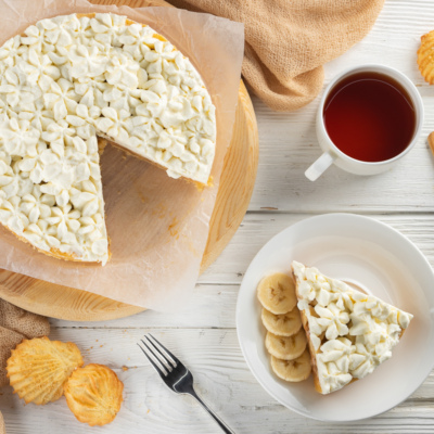 Баноффи — это английский пирог, приготовленный из бананов, взбитых сливок с творожным сыром и вареной сгущенкой. Основа готовится из измельченного печенья с добавлением сливочного масла.
