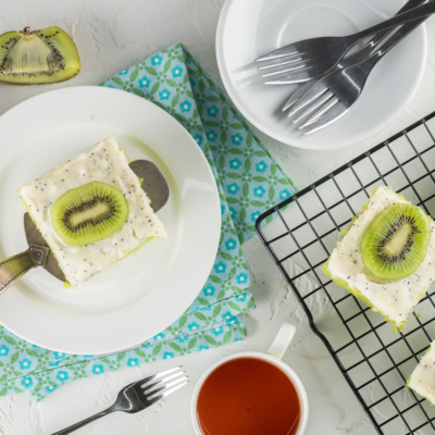 В бисквит выложить крем и равномерно распределить по всей основе. Украсить дольками киви и залить желе. Отправить в холодильник на 2 часа.