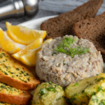 На большую тарелку посередине выложить форшмак, а вокруг все подготовленные добавки: чесночный хлеб, дольки черного хлеба, картофель, яблоки и лимон.