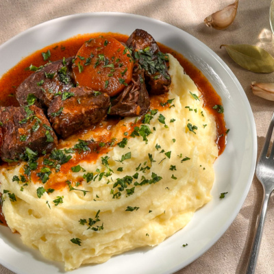 Нежная, томлёная говядина в насыщенном соусе с ароматом чеснока, тимьяна и овощей — тот самый легендарный Bœuf Bourguignon, который готовила Джулия Чайлд. Мы повторили культовый рецепт из фильма «Джули и Джулия», и получилось просто божественно.