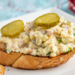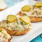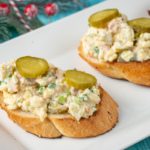 Довольно популярный салат из консервированного тунца с маринованными огурцами, яйцами и зелёным луком заиграет новыми красками, если подать его на хрустящих гренках.