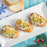 Подача пикантного рыбного салата на поджаренных ломтиках хлеба особенно актуальной будет для домашнего праздничного стола и для фуршета.