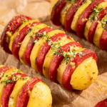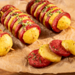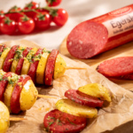 Картошка и копченая колбаса на шпажках — хрустящая, ароматная закуска с дымком и золотистой корочкой.
