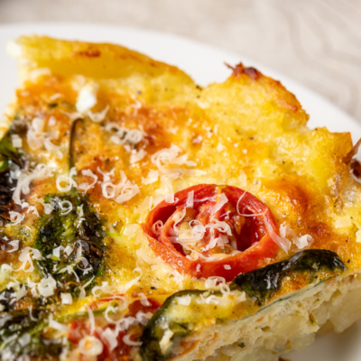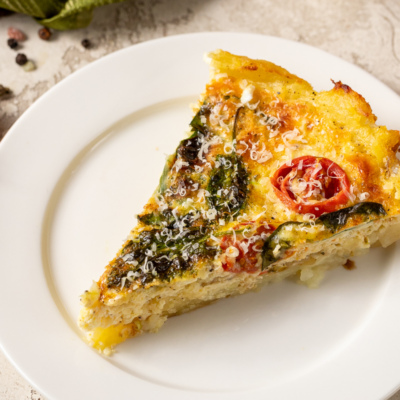 На основу из картофеля выложить натертый сыр, помидоры черри, листья шпината и залить заливкой.