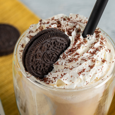 Взбивать милкшейк на максимальной мощности 1-2 минуты. Готовый милкшейк украсить взбитыми сливками и печеньем.