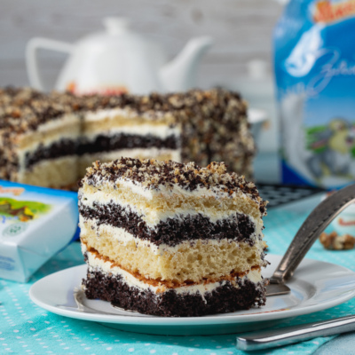 Коржи смазать кремом и собрать торт чередуя темные и светлые коржи.