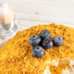 Другую часть коржа и остальные кусочки бисквита нарезать на небольшие кубики. Также оставить несколько кусочков бисквита для посыпки.