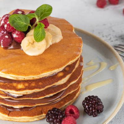 Положить панкейк на тарелку, смазать его шоколадной пастой, поверх выложить дольки банана и также повторить с каждым.