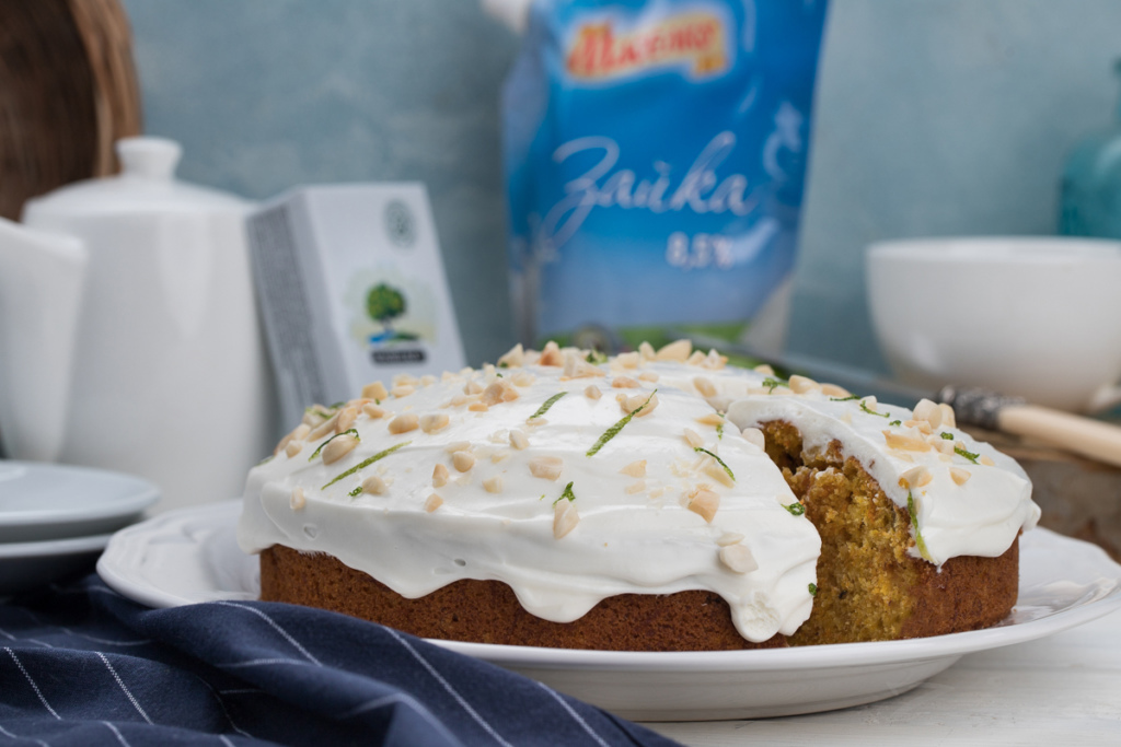 Распределить крем поверх остывшего пирога, украсить цедрой и орехами.