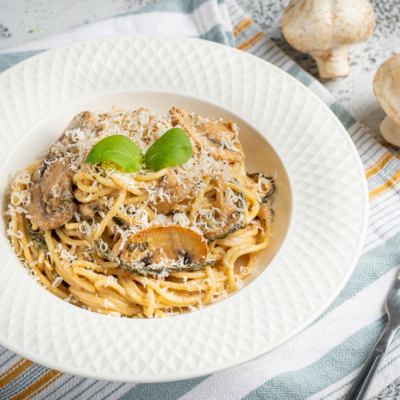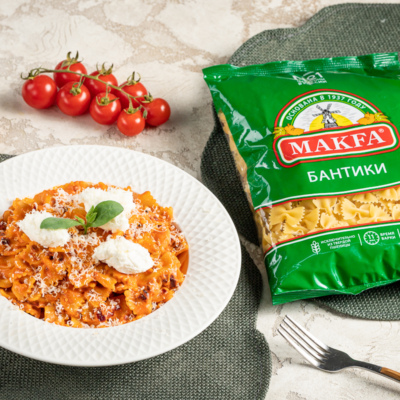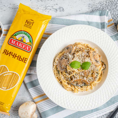 В рецепте мы использовали «Спагетти яичные» MAKFA, с которыми можно приготовить множество вкусных блюд. Макаронные изделия содержат сухой яичный меланж — смесь белка и желтка куриных яиц. Благодаря содержанию яиц эти спагетти более насыщены такими важными для организма человека элементами, как фосфор и железо. А еще они изготовлены из пшеницы твердых сортов, поэтому прекрасно сохраняют форму и вкусовые свойства при варке.