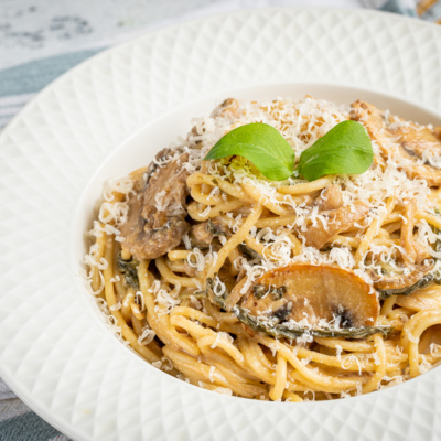 Сливочная паста со шпинатом, грибами и карамелизированным луком имеет насыщенный аромат и сладковатый вкус с тонкими нотками бальзамического уксуса.