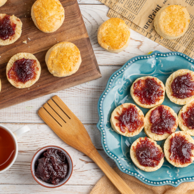 Разрезать скон пополам, намазать можно маслом, творожным сыром и сверху выложить джем или варенье.