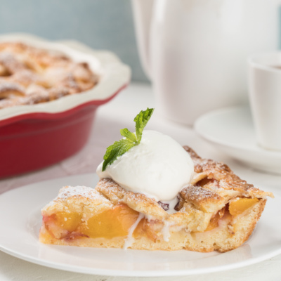 Испечь его можно абсолютно с любыми фруктами и ягодами, но сейчас, в сезон персиков, нельзя не приготовить и не насладиться кусочком вкуснейшего пирога именно с ломтиками сочного и сладкого персика!