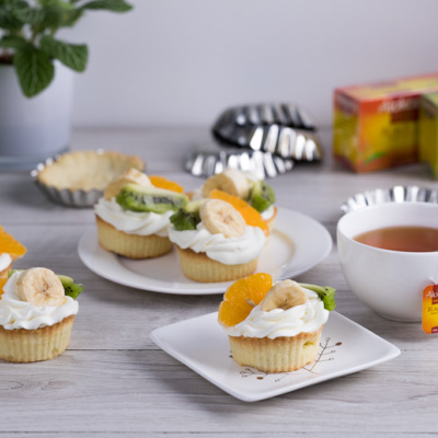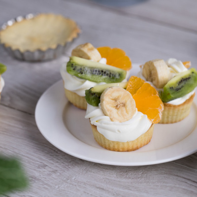 Наполнить корзиночки кремом из кондитерского мешка и украсить любыми фруктами по желанию.
