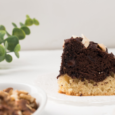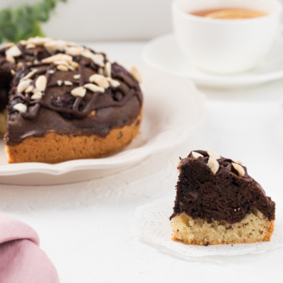 Остудить пирог, освободить от формы и полить глазурью, украсить шоколадными каплями и лепестками миндаля.