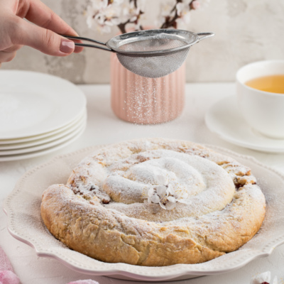 Выпекать 30 минут при 190 С. Остывший пирог вынуть и посыпать сахарной пудрой.