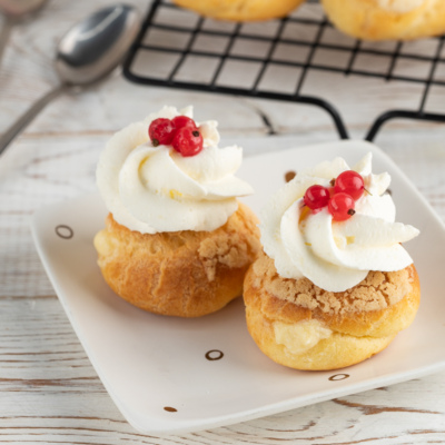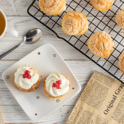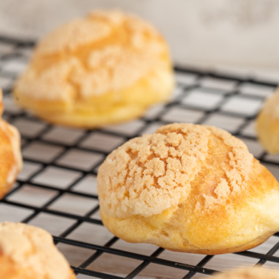 Французские заварные пирожные Шу – любимое многими лакомство. Шарик из тонкого хрустящего заварного теста со сладкой корочкой из песочного теста «кракелин», внутри которого скрывается нежный ванильный крем, похожий на сливочный пломбир.