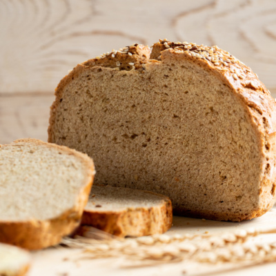 Смазать верх хлеба смесью желтка и воды и посыпать кунжутом и семенами льна.