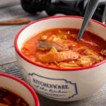 В глубокую тарелку или касушку выложить отварной рис, сверху налить суп и подавать к столу.