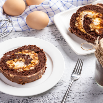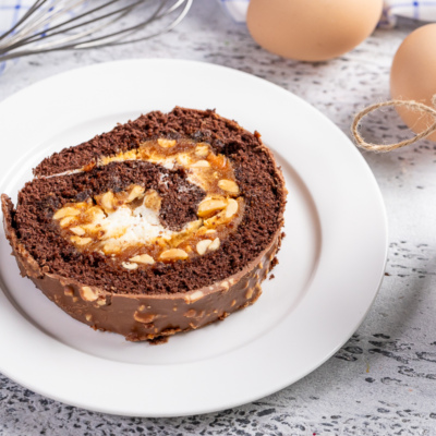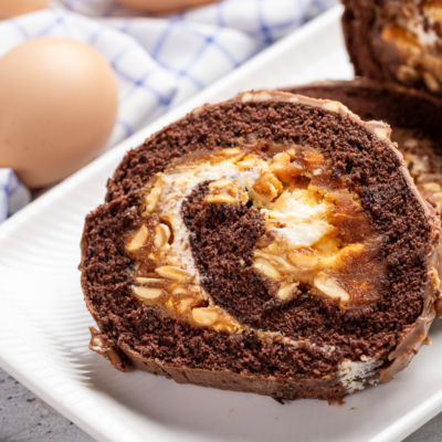 Шоколадный насыщенный бисквит в сочетании с карамелью и нежным сливочным кремом, украшенный шоколадной глазурью с орешками — это невероятно вкусно! Рулет «Сникерс» станет украшением любого праздничного застолья.