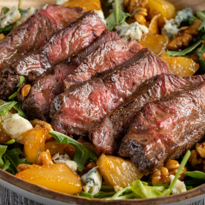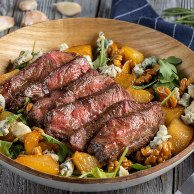 Это изысканный салат, в котором сочетаются вкус сладкой груши, хрустящей зелени, сыра и нежного жареного стейка из говядины.