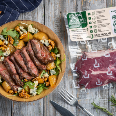 Для стейка мы взяли топ-блейд от Jizzax Organic. Это мясо лопатки с высокой степенью мраморности. Его особенность в вакуумной упаковке, что делает мясо безопасным, ведь:
