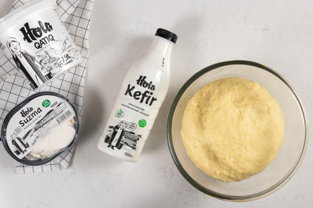 Приготовить опару. Добавить в теплый катык дрожжи и 1 столовую сахара. Перемешать и накрыть салфеткой. Оставить на 15 минут, смесь должна запениться.