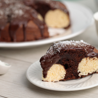 Сочетание творожно-кокосовой основы с супершоколадным бисквитом делает вкус этой выпечки неповторимой.
