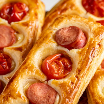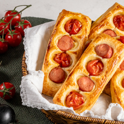 Красивый и сытный перекус из минимального количества продуктов — аппетитные слойки с сосисками и помидорами черри.