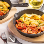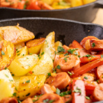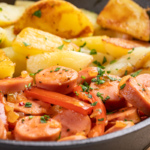 Это незамысловатое, но при этом аппетитное блюдо идеально подходит для сытного обеда без лишних хлопот. Хрустящая картошка в сочетании с румяными сосисками, обжаренными с овощами и острым соусом — это просто и очень вкусно.
