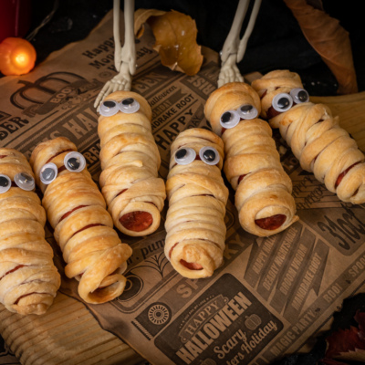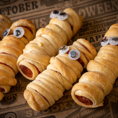 Сосиски в тесте «Мумии» — интересная закуска на «страшный» стол в честь Хеллоуина. Порадуйте своих детей, приготовив такие оригинальные угощения на праздник.