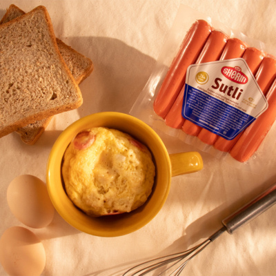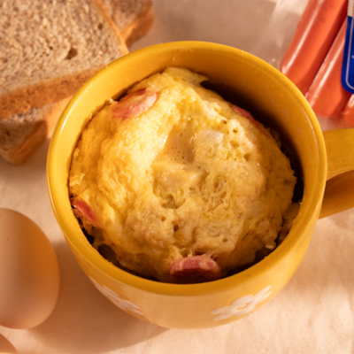 Сытный омлет в кружке — проще не придумаешь. Яйца, сосиски, хлеб кубиками, сыр — все в кружку, перемешать и в микроволновку. Пара минут — и горячий завтрак готов, справится даже ребенок.