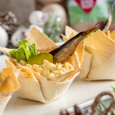 Оригинальный вариант закуски на праздничный стол — тарталетки из лаваша с яичной начинкой и шпротами. Такие корзинки можно наполнить и другими начинками: сырной массой, салатом, мясной начинкой или творогом.