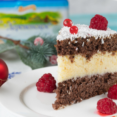 Как и одноименный шоколадный батончик, торт щедро сдобрен кокосовой стружкой и мягкие бисквитные коржи идеально сочетаются с молочно-кокосовой начинкой.