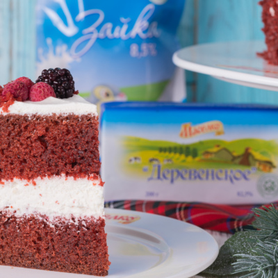 Шикарный праздничный торт «Красный бархат» — настоящее украшение застолья! Изысканный десерт, состоящий из ярких коржей на фоне контрастного белоснежного крема.