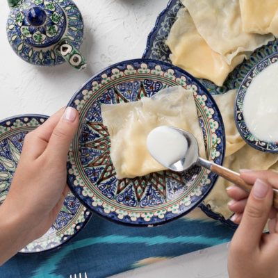 Готовый тухум-барак выкладывать на большое блюдо, поливая растопленным маслом. Подавать со сливками и сметаной.