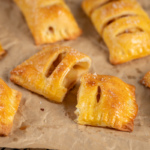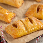 Пироги выложить на противень застеленный пергаментом. Смазать смесью желтка и воды, посыпать щепоткой сахара.