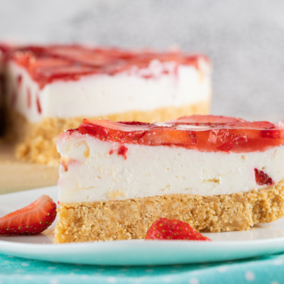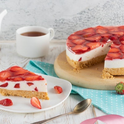 Слайсы клубники по кругу выложить на застывший творожный слой и аккуратно вылить остуженное желе. Отправить торт в холодильник на 3 часа.