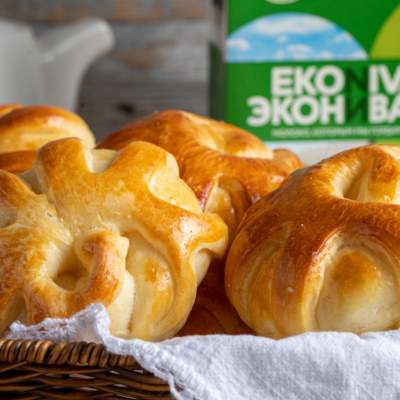 Смазать поднявшиеся булочки смесью желтка и воды и отправить в разогретую до 180ºС духовку на 15-20 минут.